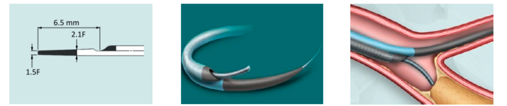 With its rapid exchange (Rx) delivery lumen and the additional over the wire (OTW) lumen the NHancer Rx microcatheter is a versatile tool for dual guide wire procedures. The reinforced shaft and unique removable stylet facilitate pushability, while the market smallest profile allow for trapping in a 6F guiding catheter
